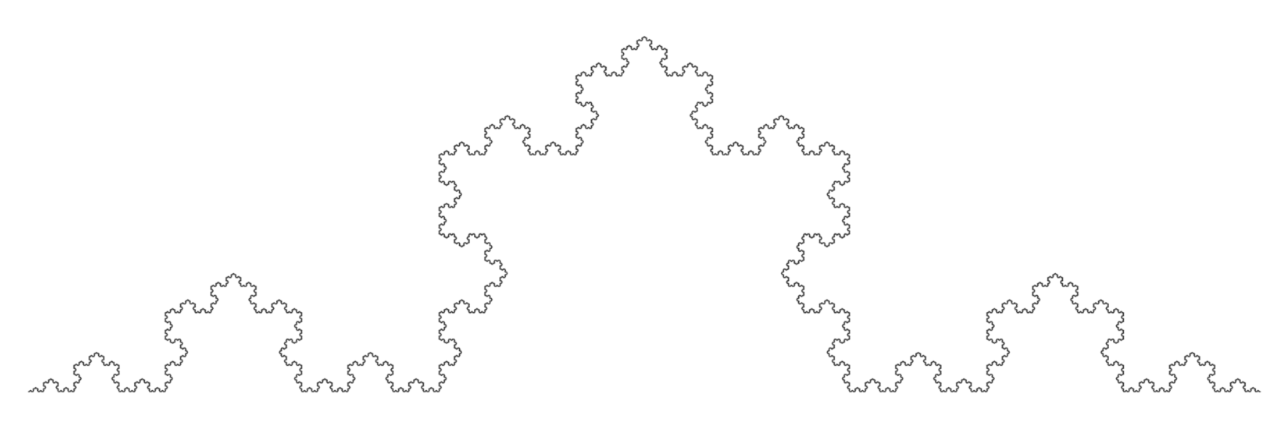 Simple shapes, like the ones you learned about in middle school geometry, can be associated with whole number dimensions. For example, a line is one dimension (length), a solid square is 2 dimensions (length and width), and a cube is 3 dimensions (length, width and depth). However, fractals don’t scale or fill space like these shapes do. Rather than being defined by the simple dimensions of length, width, and depth, mathematicians define each fractal as a unique non-integer Hausdorff dimension. A Hausorff dimension can be understood as the exact number of dimensions assigned to a shape for it to have a finite, non-zero size [2]. For example, the Koch curve (shown below) is more complicated than a line in one dimension, as it is an infinite pattern and thus an infinite length, but it also doesn’t fill the space like a solid square does in the second dimension. If we assigned it to the dimension 1, it would be infinite, but to the dimension 2 its size is 0, as it doesn’t have area. Its Hausdorff dimension is 1.26 [3].