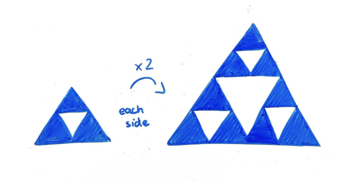 However, with the famous Sierpiński triangle fractal, doubling it would result in an area three times as big [4], as shown on the graphic below: