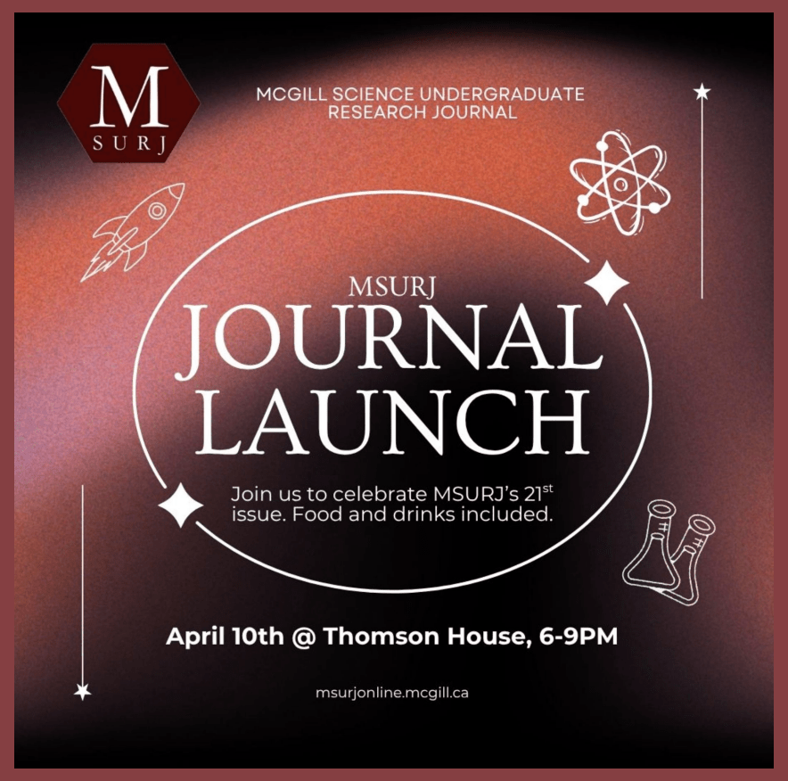 The McGill Science Undergraduate Research Journal (MSURJ) is proud to be publishing its 21st volume! We are celebrating the launch of our journal at Thomson House (3650 McTavish) at 6 PM on April 10th, 2026.